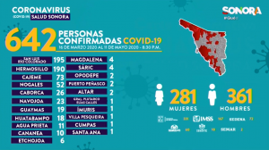 Aunado a eso la Secretaría de Salud en su reporte diario, presentado la noche de este lunes 11 de mayo, lamentó el fallecimiento de 4 personas; 2 de Ciudad Obregón, 1 de SLRC y una más de Guaymas; así como la confirmación de 54 nuevos casos en Sonora; 21 de Cajeme, 18 de Hermosillo, 6 de Caborca, 3 de Guaymas, 2 de Nogales, 1 en SLRC y uno más en Navojoa; reiterando el llamado a reforzar las medidas se higiene y sana distancia, mismas que serán analizadas por el Consejo Estatal de Salud.