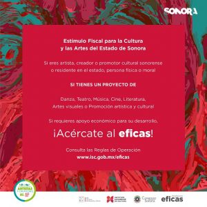 El próximo 12 de agosto será el segundo cierre del año para evaluación de propuestas; los empresarios decididos a apoyar económicamente proyectos artísticos y culturales con impacto social y cultural en la entidad, pueden obtener el estímulo fiscal y acreditar el 100% del apoyo otorgado contra el Impuesto sobre Remuneración al Trabajo Personal a su cargo. Más información en los teléfonos (662) 212 6570 y 71, extensión 1004, y correo eficas@isc.gob.mx, del 1 al 12 de agosto 2019.